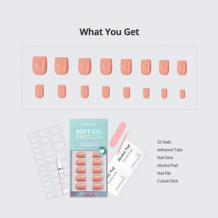 32*nail tips, 1*2G glue, 1*mini nail file, 1*cuticle stick, 32*jelly tabs, 1*clean pad, 1*manual
