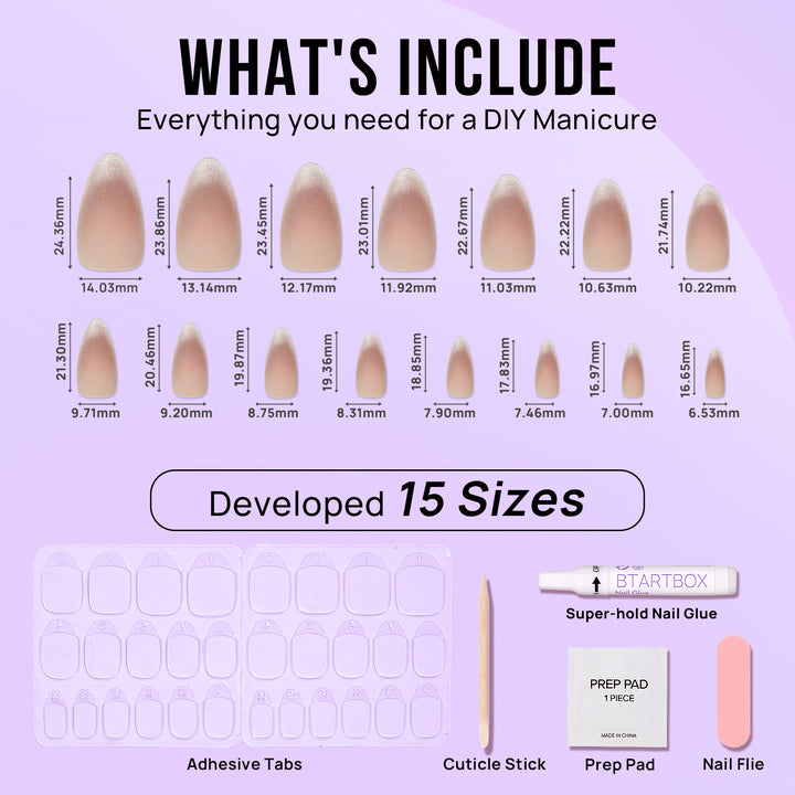 30*nail tips, 1*2G glue, 1*mini nail file, 1*cuticle stick, 30*jelly tabs, 1*clean pad, 1*manual