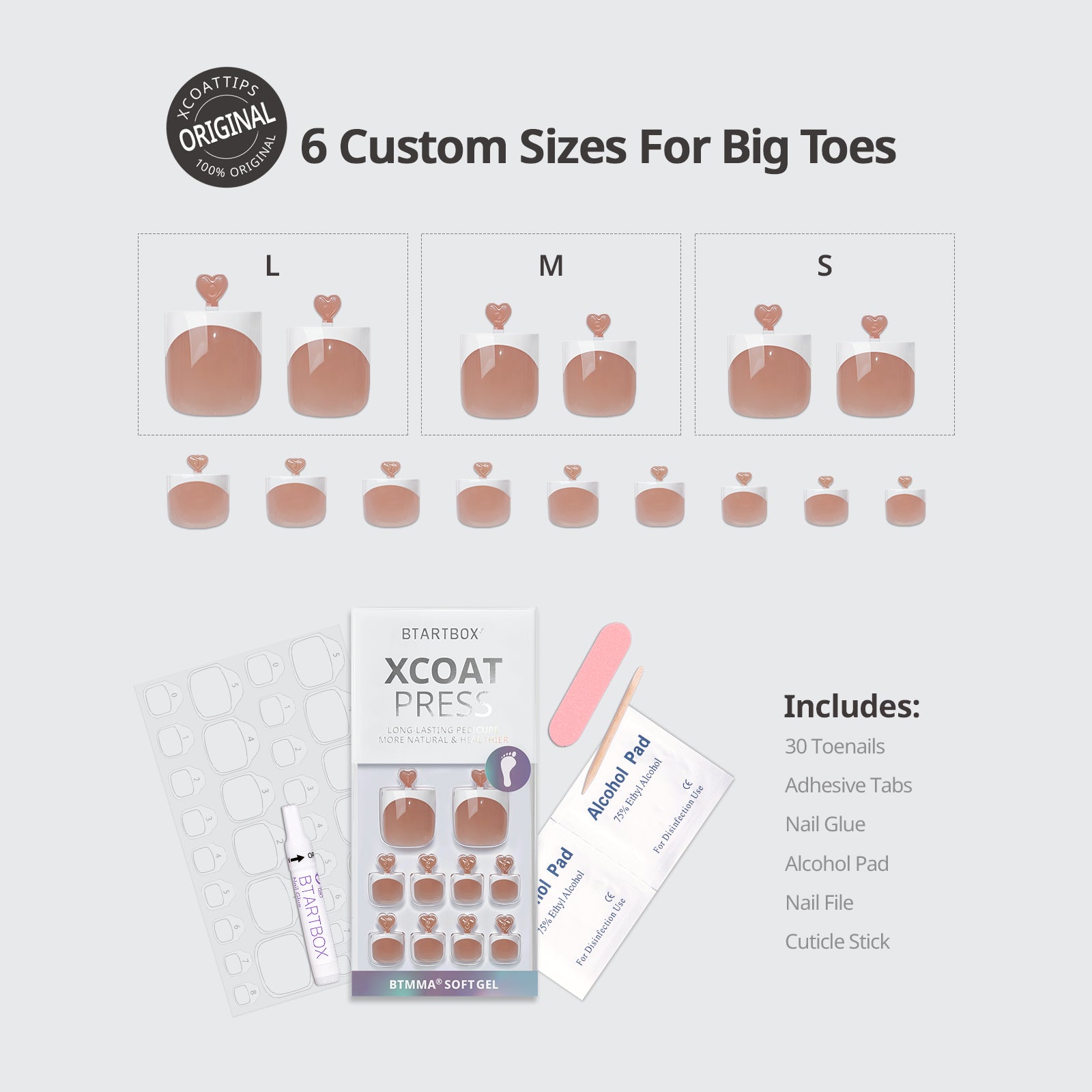 Includes: Storage box toenails*30pcs, toenail glue *1, adhesive tabs *30pcs, toenail file*1, cuticle stick*1, and Alcohol pad *1.