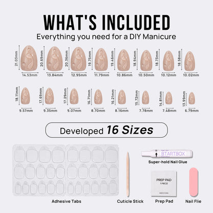 They are made with high-quality materials that are comfortable and fully customizable to your nail, using included tools. Attached with non-toxic and non-damaging glue and adhesive tabs.
