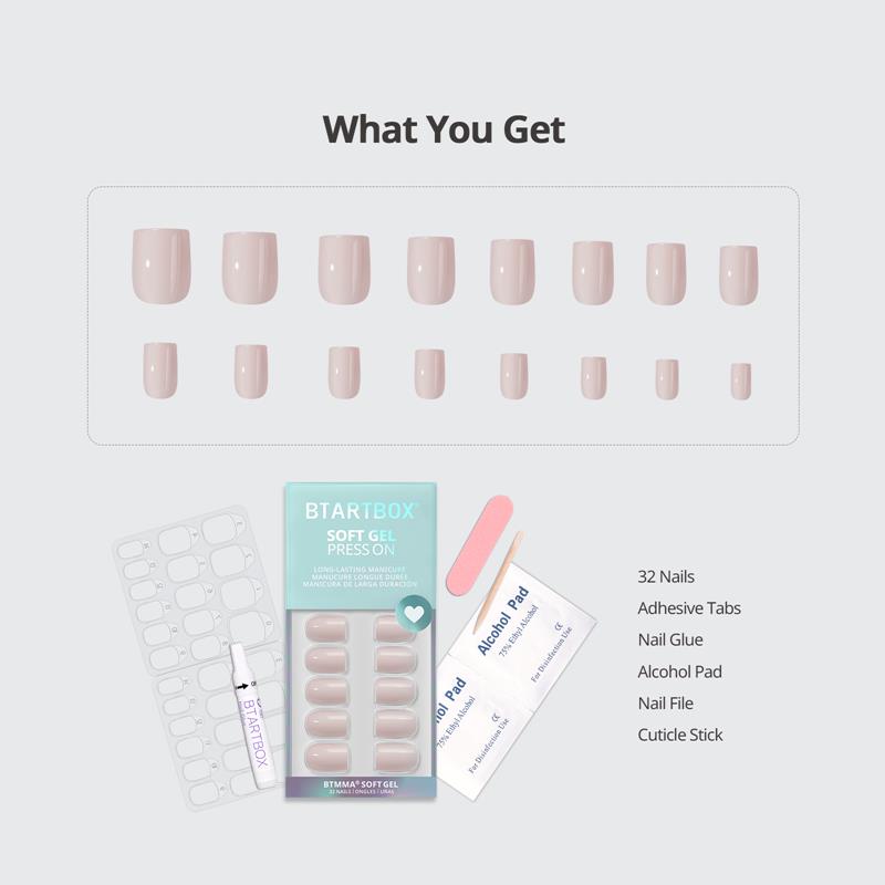 32*nail tips, 1*2G glue, 1*mini nail file, 1*cuticle stick, 32*jelly tabs, 1*clean pad, 1*manual