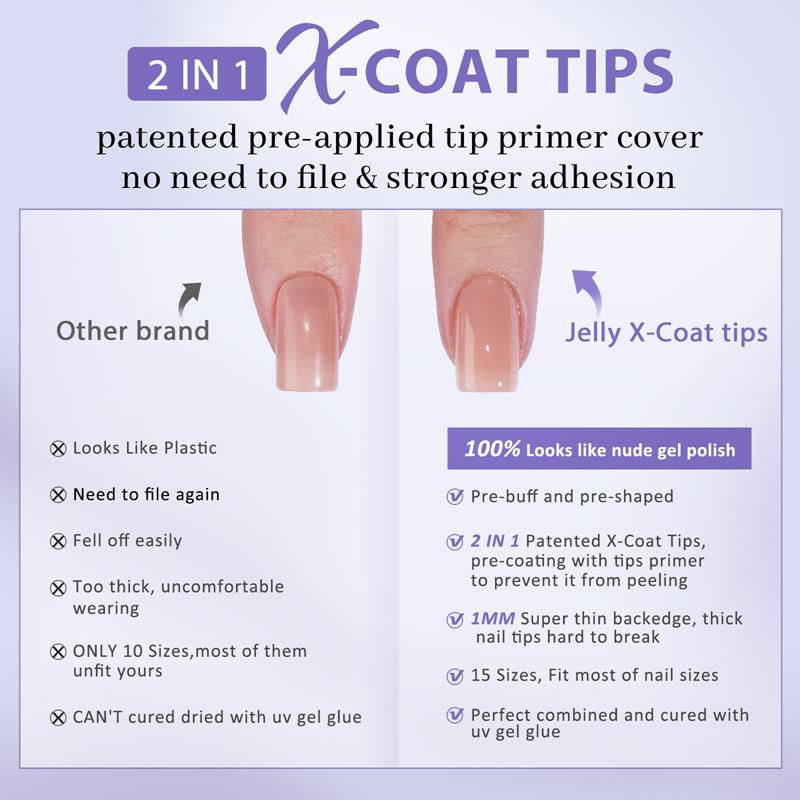 • Combined with specially patented materials and patented XCOAT process, XCOATTIPS® helps people to solve many technical problems such as shaping, color matching, and nail apex buidling.