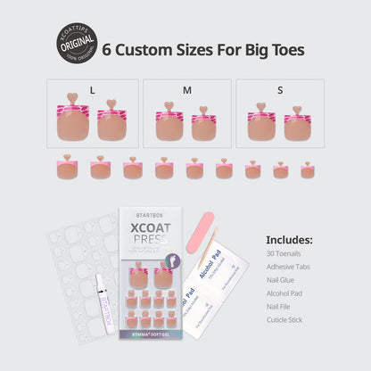 Includes: Storage box toenails*30pcs, toenail glue *1, adhesive tabs *30pcs,  toenail file*1, cuticle stick*1,  and Alcohol pad *1.