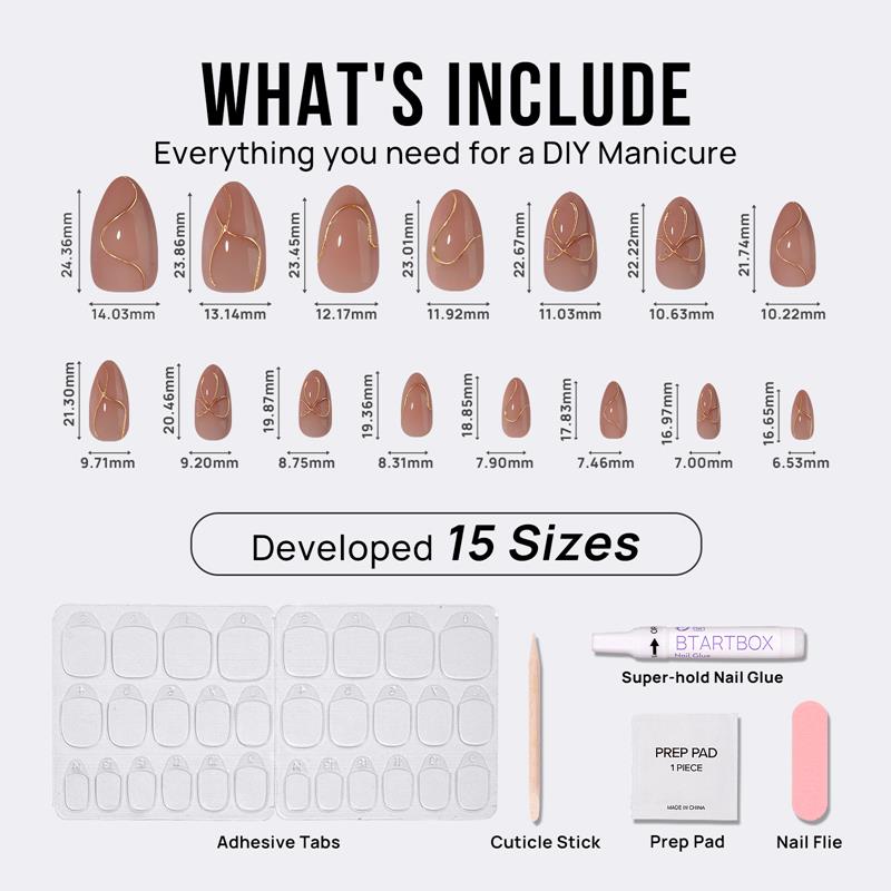 They are made with high-quality materials that are comfortable and fully customizable to your nail, using included tools. Attached with non-toxic and non-damaging glue and adhesive tabs.