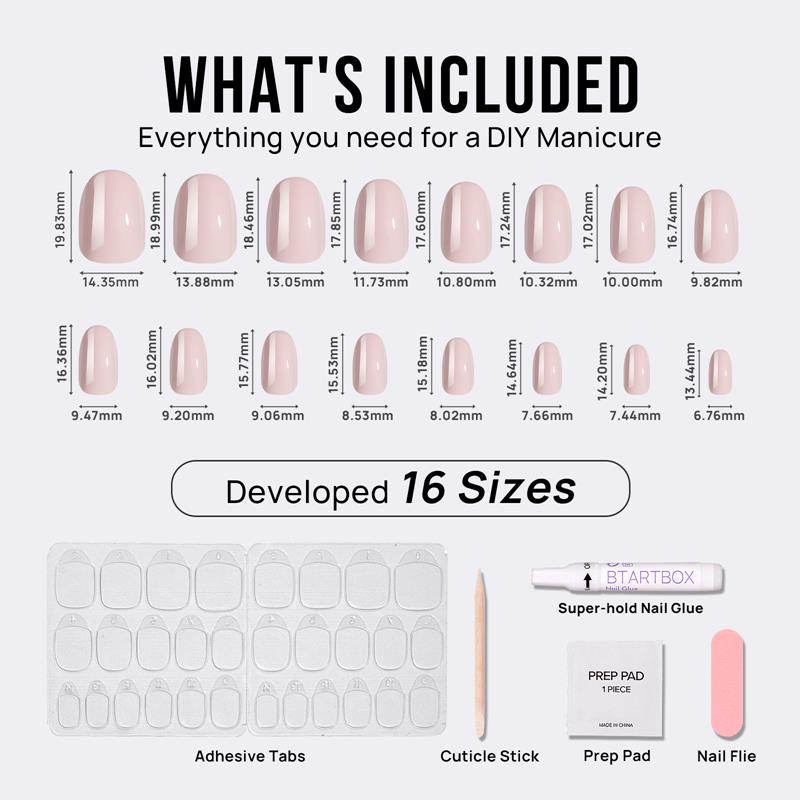 32*nail tips, 1*2G glue, 1*mini nail file, 1*cuticle stick, 32*jelly tabs, 1*clean pad, 1*manual