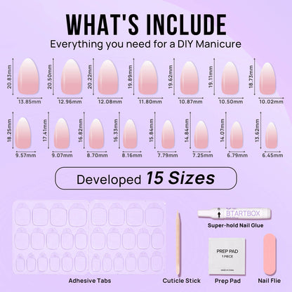 32*nail tips, 1*2G glue, 1*mini nail file, 1*cuticle stick, 32*jelly glue, 1*clean pad, 1*manual
