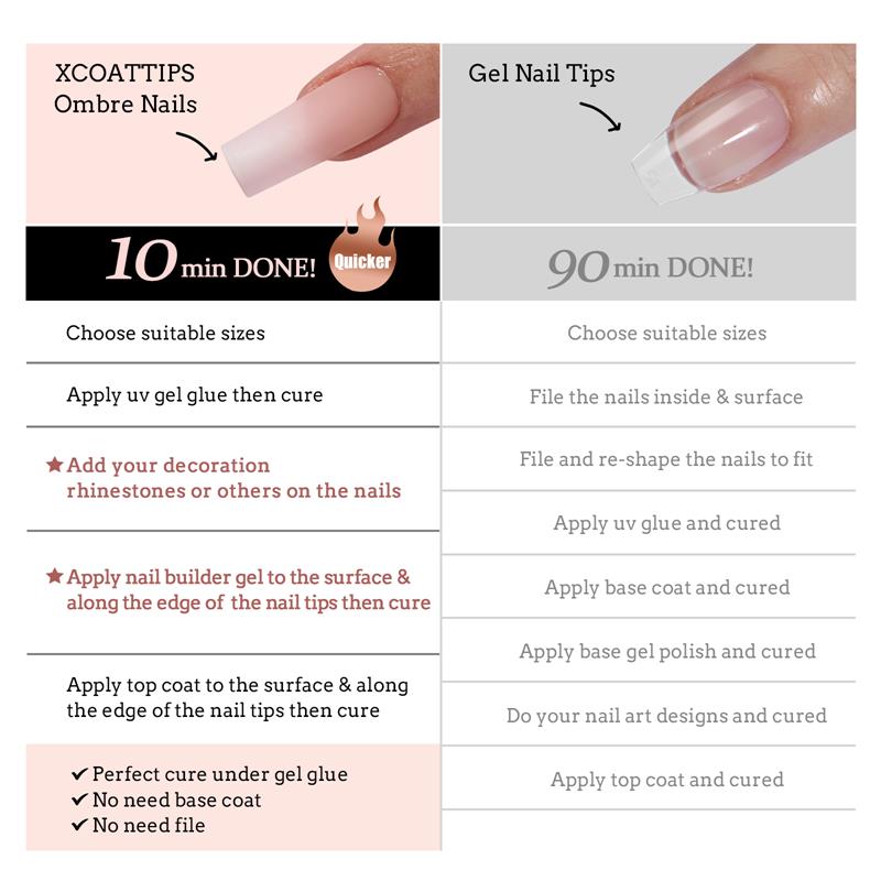 • Wear XCOATTIPS® with UV gel, then apply French Protecting Duo and seal them, easily get a Salon manicures done in 30 minutes!!!