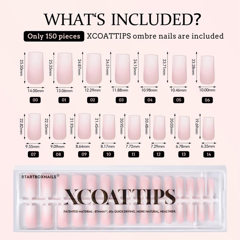 • Combined with specially patented materials and patented XCOAT process, XCOATTIPS® helps people to solve many technical problems such as shaping, color matching, and nail apex buidling.