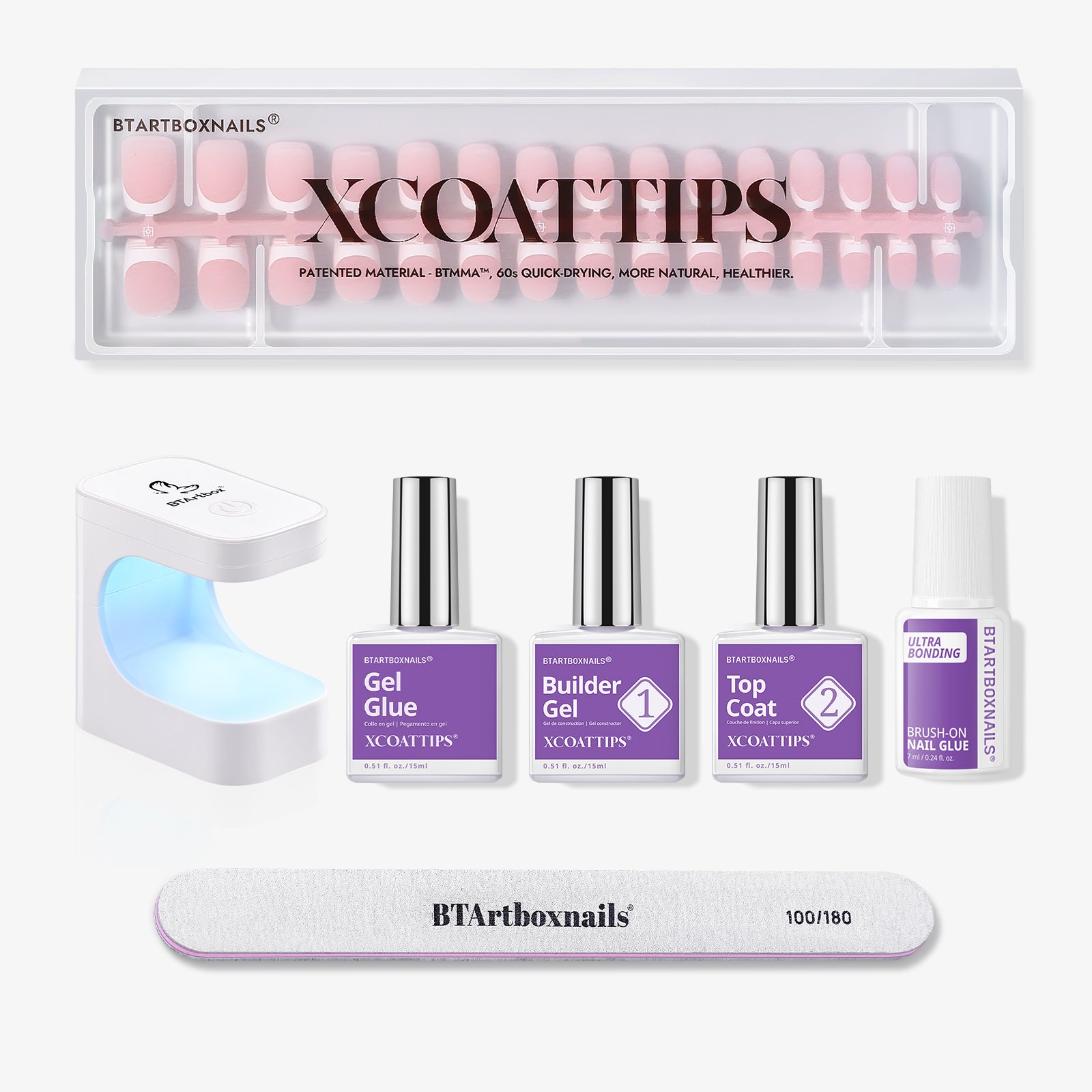• Kit Include:Nail Tips 150pcs*1,  UV Glue 15ml*1, Builder Gel 15ml (Improved formula)*1, Top Coat 15ml*1,  UV Lamp*1, Nail File*1