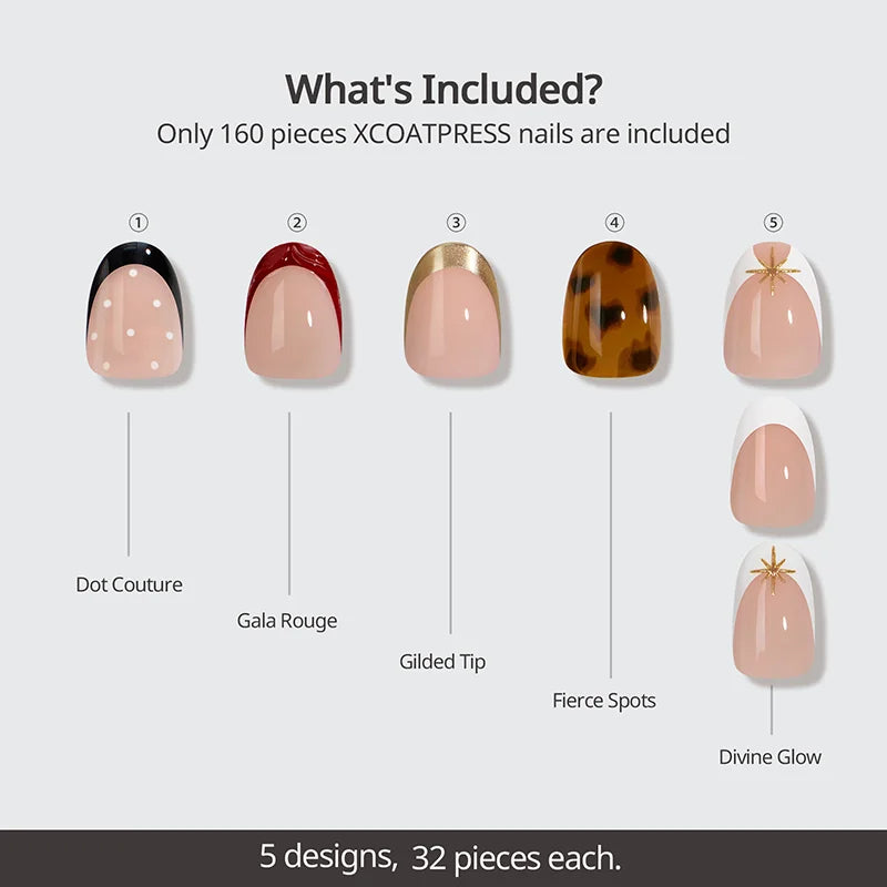 The Whispers of Glamour Short Oval - XCOATPRESS is a limited-edition collaboration between BTARTBOXNAILS × Long Hair Pretty Nails. Featuring five stunning designs—Dot Couture, Gala Rouge, Gilded Tip, Fierce Spots and Divine Glow—this set brings you endless styling possibilities in one box.