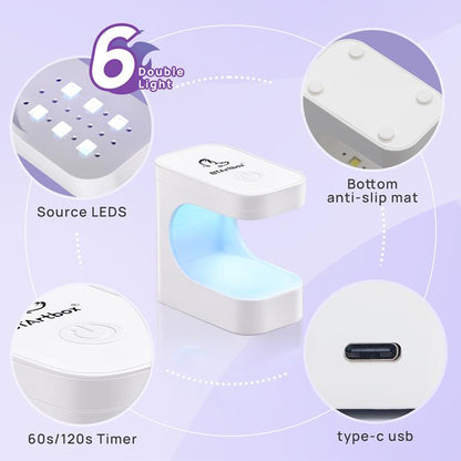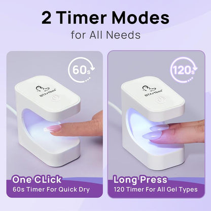 BTArtbox Mini Nail Lamp es compacta y portátil, su diseño abierto de 180° puede Inserta tus uñas de forma flexible desde diferentes direcciones.  BTArtbox mini lámpara UV admite varios tipos de arte de uñas, incluido gel de pegamento para uñas, gel de construcción para uñas, gel de pintura, esmalte de uñas en gel, etc. Con una potencia de 6 vatios, no causará daño a los ojos y la piel.