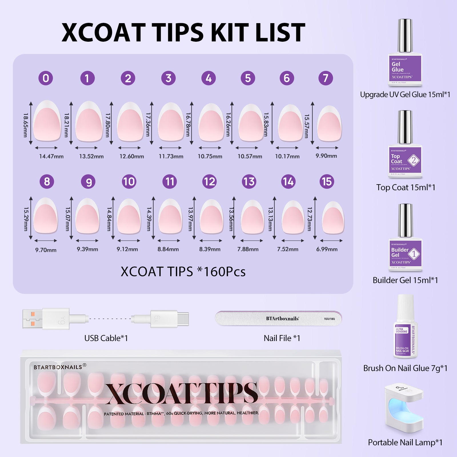 • Combined with specially patented materials and patented XCOAT process, XCOATTIPS® helps people to solve many technical problems such as shaping, color matching, and nail apex buidling.