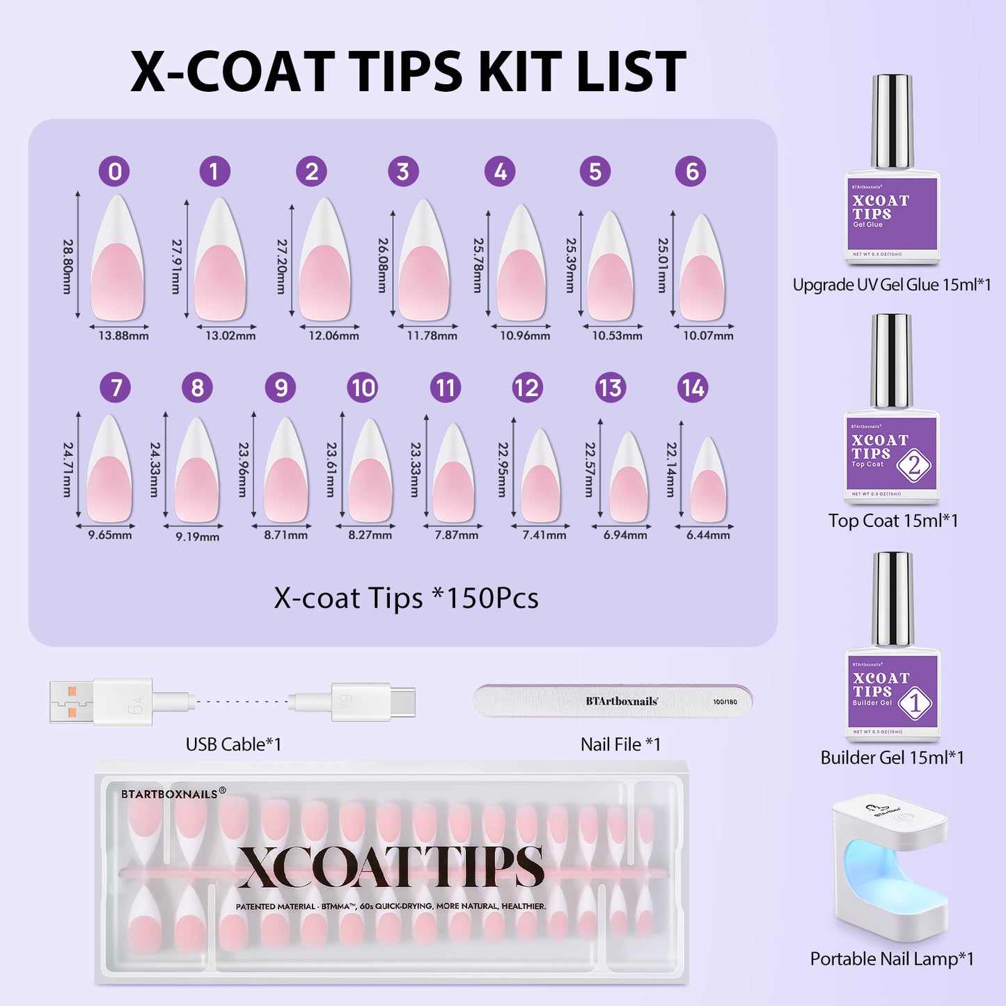• Combined with specially patented materials and patented XCOAT process, XCOATTIPS® helps people to solve many technical problems such as shaping, color matching, and nail apex buidling.