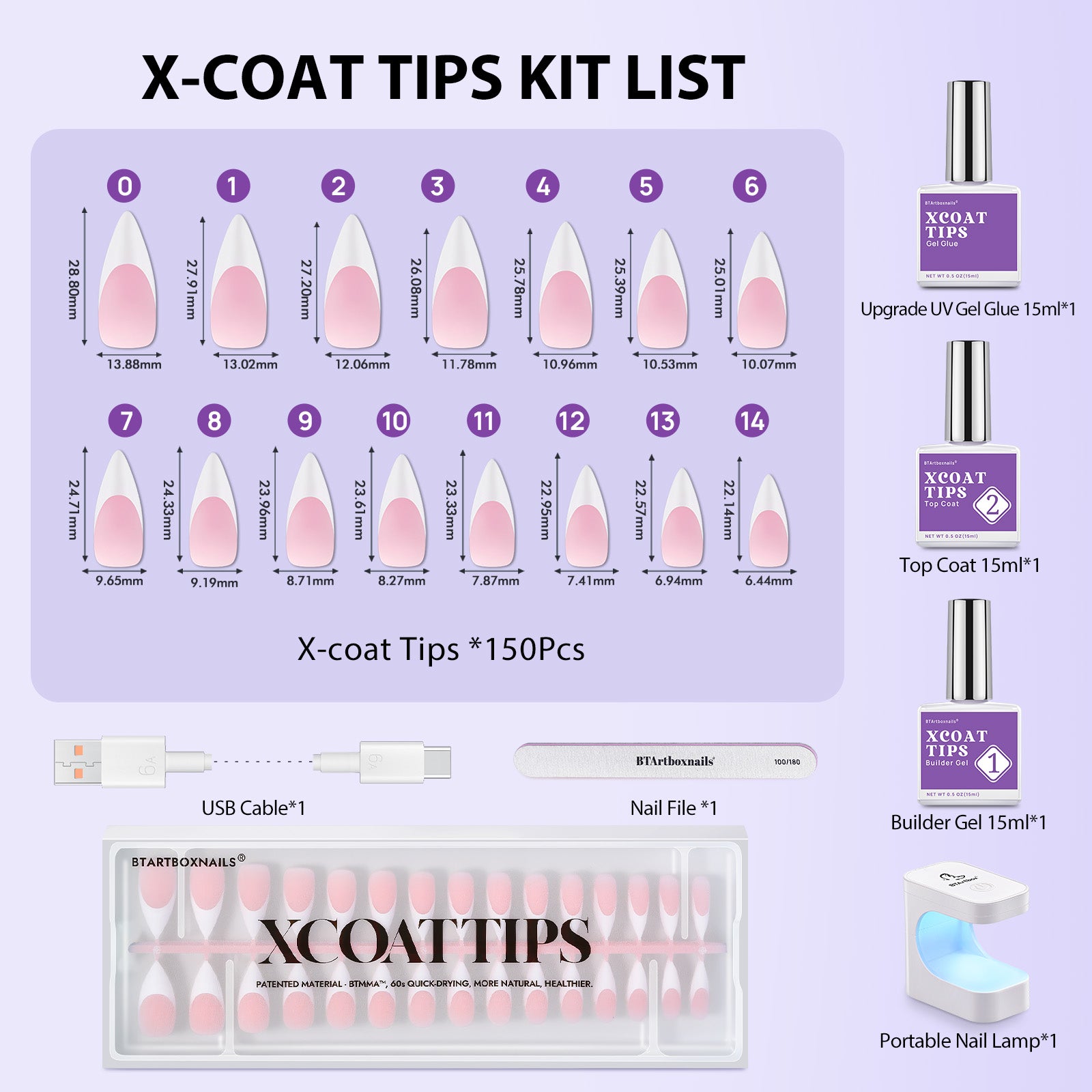 • Kit Include:Nail Tips 150pcs*1,  UV Glue 15ml*1, Builder Gel 15ml (Improved formula)*1, Top Coat 15ml*1,  UV Lamp*1, Nail File*1