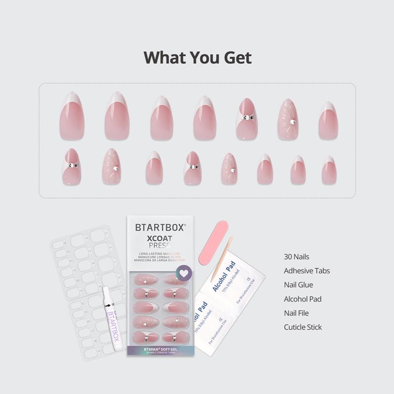30*nail tips, 1*regular glue, 1*mini nail file, 1*cuticle stick, 30*jelly tabs, 1*clean pad, 1*manual