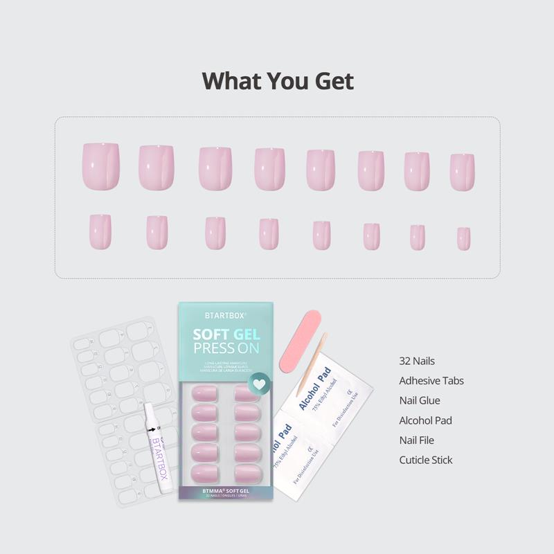 32*nail tips, 1*2G glue, 1*mini nail file, 1*cuticle stick, 32*jelly tabs, 1*clean pad, 1*manual