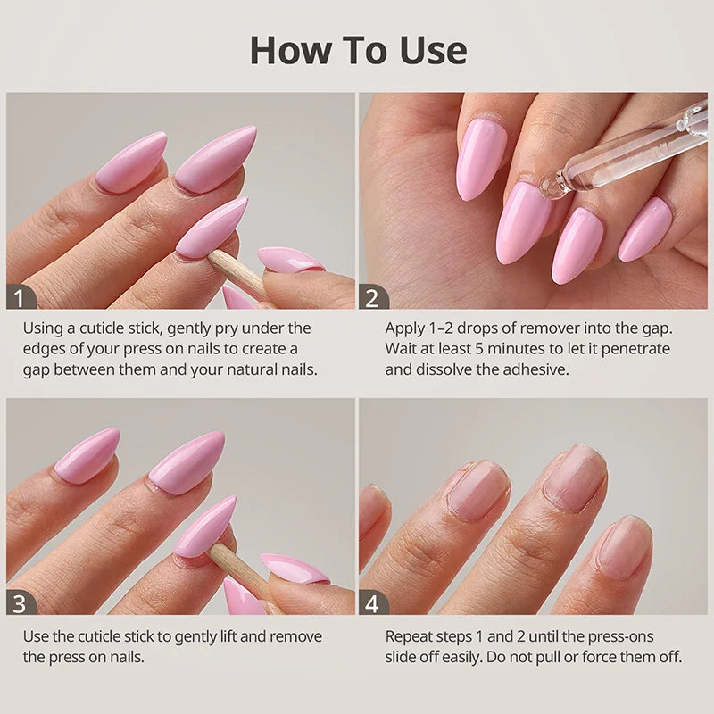 Usa la Colla per Unghie con Pennello per un’applicazione sicura di unghie press-on, punte finte e nail art. Usa il Solvente per Colla per una rimozione rapida e indolore della colla per unghie non polimerizzata UV e delle press-on, ideale per la cura post-manicure.