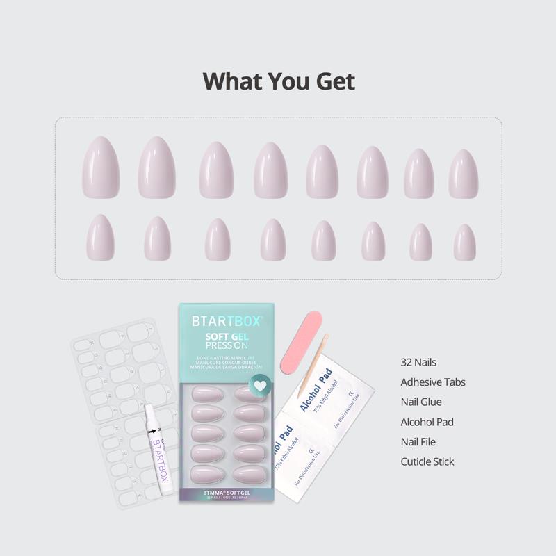 32*nail tips, 1*2G glue, 1*mini nail file, 1*cuticle stick, 32*jelly tabs, 1*clean pad, 1*manual