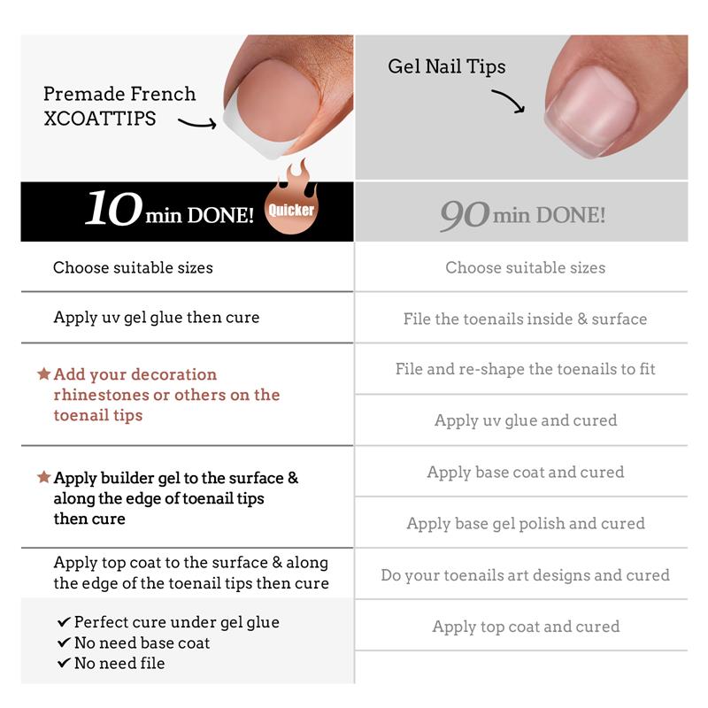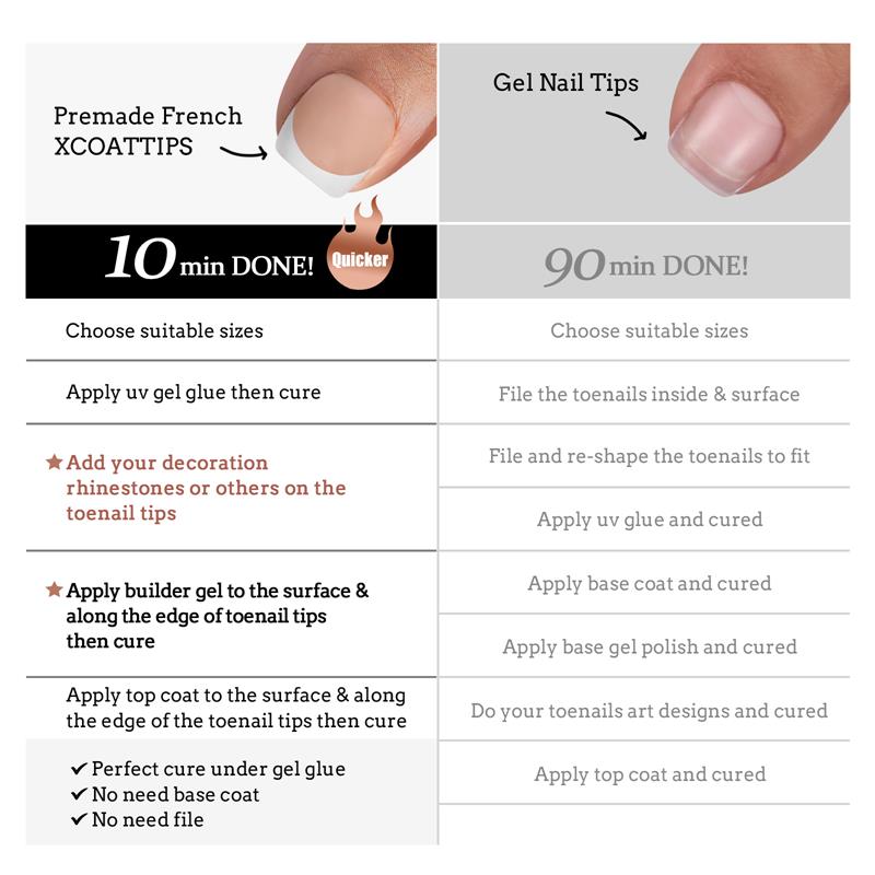 • Wear XCOATTIPS® with UV gel, then apply French Protecting Duo and seal them, easily get a Salon manicures done in 30 minutes!!!