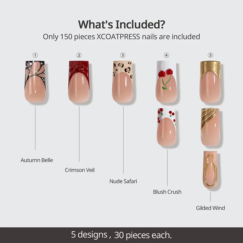 The Autumn Muse Long Square - XCOATPRESS is a limited-edition collaboration between BTARTBOXNAILS × Long Hair Pretty Nails. Featuring five stunning designs—Blush Crush, Crimson Veil, Nude Safari, Autumn Belle, and Gilded Wind—this set brings you endless styling possibilities in one box.