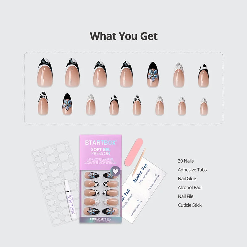 They are made with high-quality materials that are comfortable and fully customizable to your nail, using included tools. Attached with non-toxic and non-damaging glue and adhesive tabs.