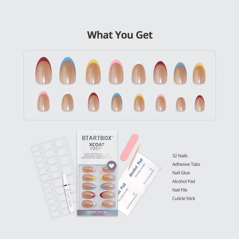 32*nail tips, 1*regular glue, 1*mini nail file, 1*cuticle stick, 32*jelly tabs, 1*clean pad, 1*manual