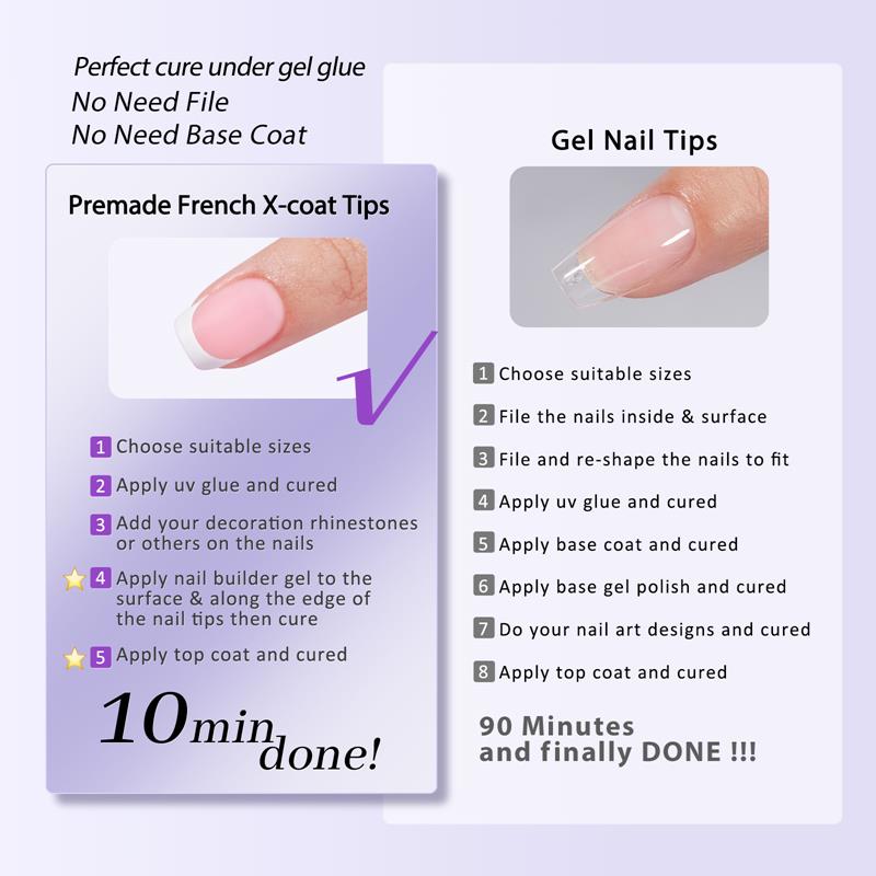 • Wear XCOATTIPS® with UV gel, then apply French Protecting Duo and seal them, easily get a Salon manicures done in 30 minutes!!!