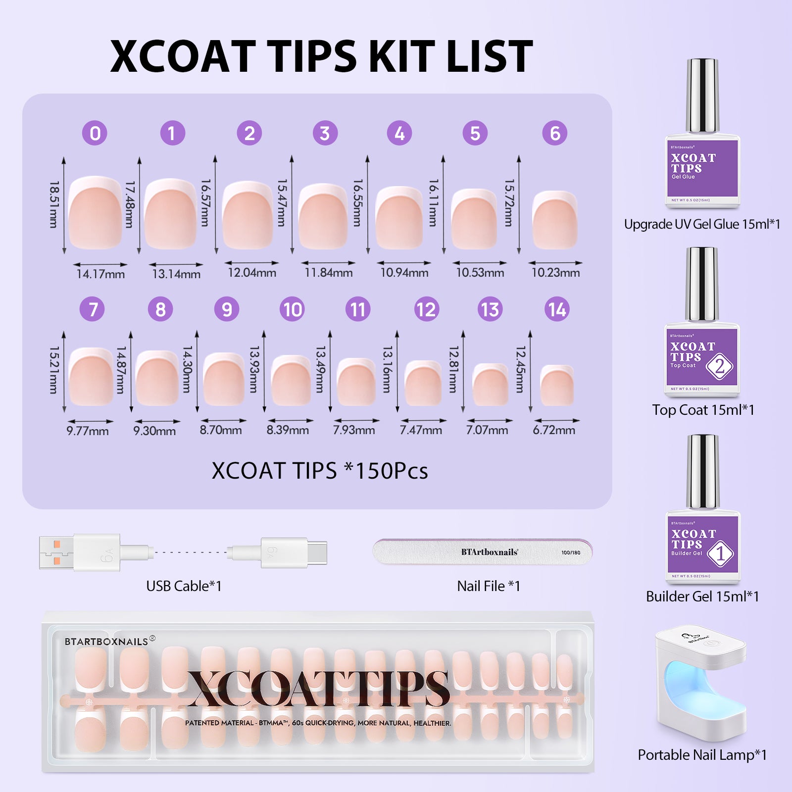 • Combined with specially patented materials and patented XCOAT process, XCOATTIPS® helps people to solve many technical problems such as shaping, color matching, and nail apex buidling.