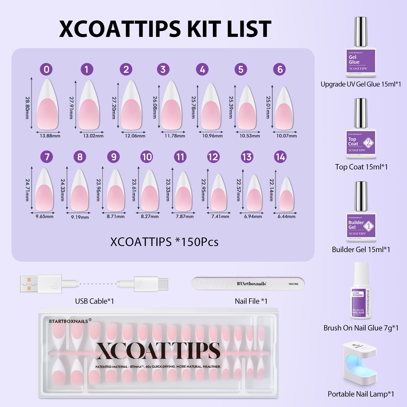 - Kit Include:Nail Tips 150pcs*1, UV Glue 15ml*1, Builder Gel 15ml (Improved formula)*1, Top Coat 15ml*1, UV Lamp*1, Nail File*1