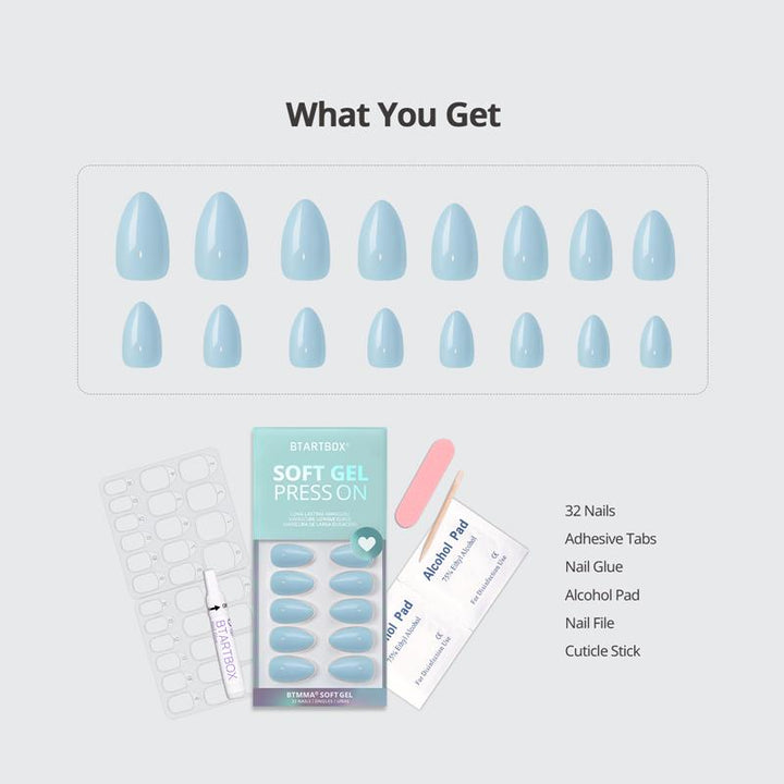 32*nail tips, 1*2G glue, 1*mini nail file, 1*cuticle stick, 32*jelly tabs, 1*clean pad, 1*manual