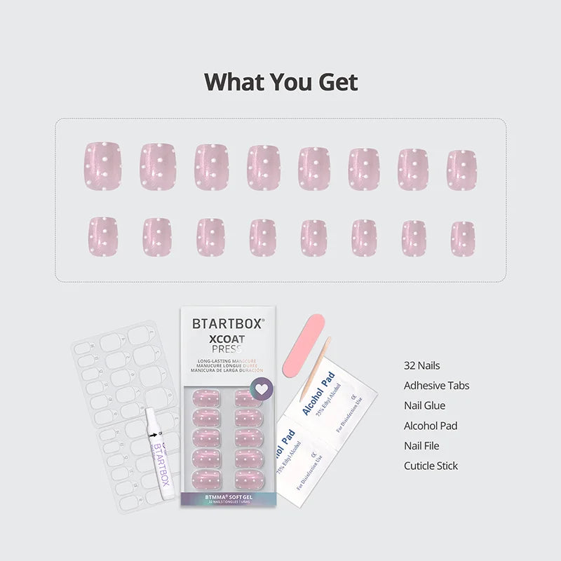32*nail tips, 1*regular glue, 1*mini nail file, 1*cuticle stick, 32*jelly tabs, 1*clean pad, 1*manual