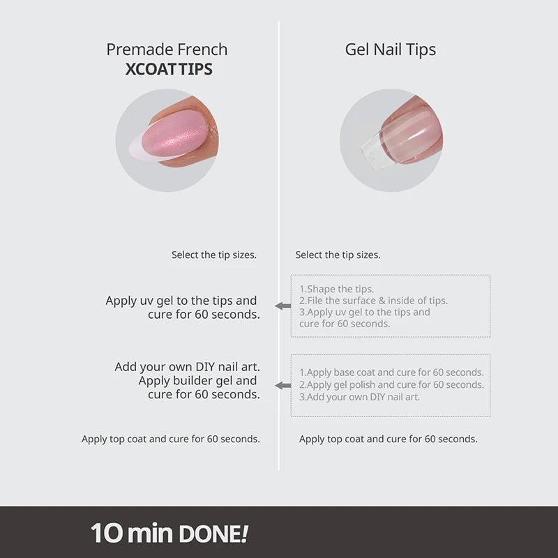 • Wear XCOATTIPS® with UV gel, then apply French Protecting Duo and seal them, easily get a Salon manicures done in 30 minutes!!!