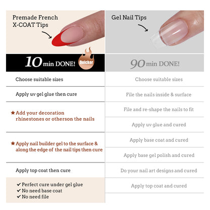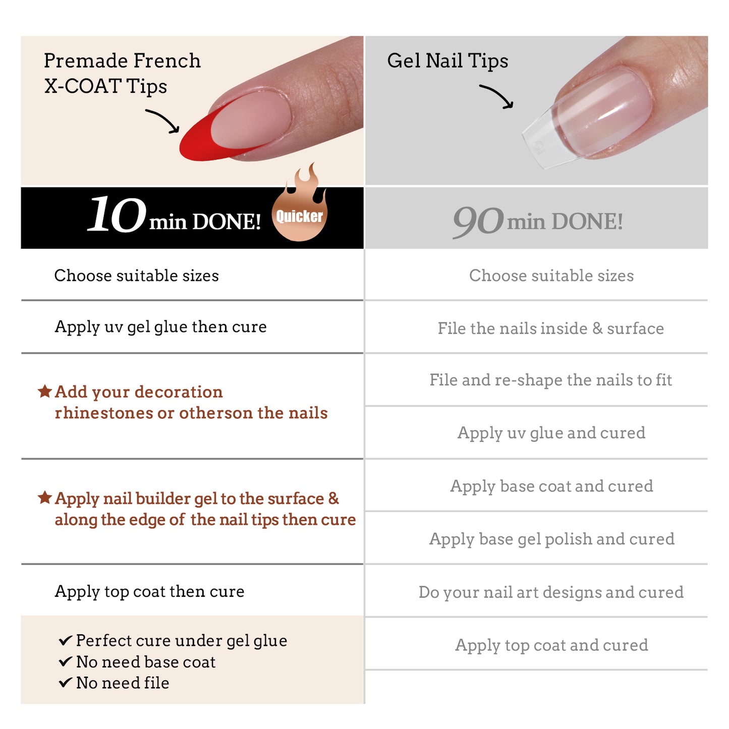 • Wear XCOATTIPS® with UV gel, then apply French Protecting Duo and seal them, easily get a Salon manicures done in 30 minutes!!!