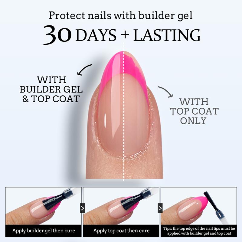 6: Apply builder gel and cure 60’s, Then apply Top coat and cure 60’s (Capped the edged of the nails each steps)