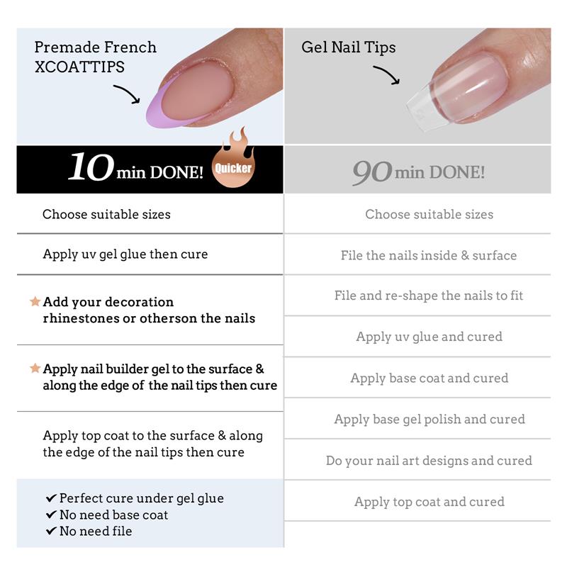 • Wear XCOATTIPS® with UV gel, then apply French Protecting Duo and seal them, easily get a Salon manicures done in 30 minutes!!!