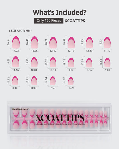 • Combined with specially patented materials and patented XCOAT process, XCOATTIPS® helps people to solve many technical problems such as shaping, color matching, and nail apex buidling.